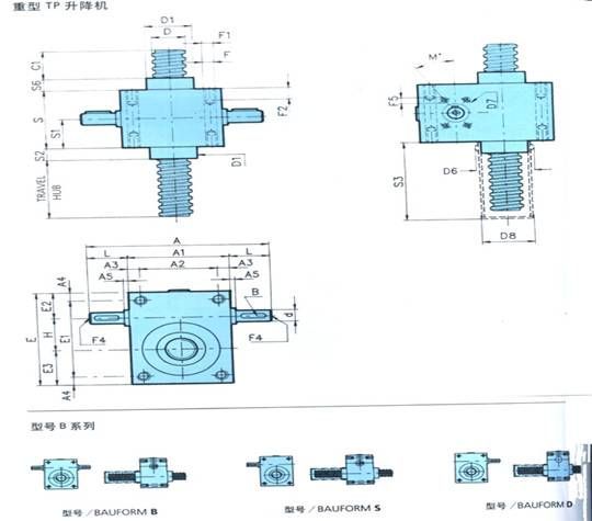 螺桿升降機:TP軸向運動螺桿。驅動軸旋轉帶動蝸輪并產生螺桿的軸向直線運動。螺桿必須有抗旋轉功能;TPR配備旋轉歸納法桿與支撐螺母,驅動軸旋轉帶動蝸輪旋轉。蝸輪與螺桿連接,因而也帶動螺桿旋轉。支撐螺每間把螺桿的旋轉運動轉變成直線運動。支撐螺母必須具有抗旋轉功能。為滿足用戶的廣泛需要,本公司可提供各種螺桿頭,也可按用戶要求定做,TP也可按用戶要求定作千斤頂以滿足用戶特殊機器的特殊要求,產品各大系列均采用雙導軌,確保升機能在最惡劣的條件下發揮最佳工作效能。特殊的密封技術使蝸桿,螺桿升降機蝸輪體系能長期在良好的潤滑狀態下運轉。
